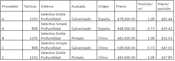 La bodega de inventario tiene una dimensión de 22m x 50m (1,100 m2). Actualmente maneja un inventario promedio mensual de 500 tarimas y en la bodega no cabe una tarima más. Sus ventas están en crecimiento y el departamento de ingeniería ha sugerido cambiar el tipo de almacenamiento para aprovechar mejor el área de la bodega. La propuesta es utilizar rack selectivo. La idea suena muy interesante y se decide a evaluar la inversión. Sin embargo, al ser una empresa de alto crecimiento la inversión de su capital es muy importante. Se ha incursionado en la aventura y llega a las siguientes cotizaciones: